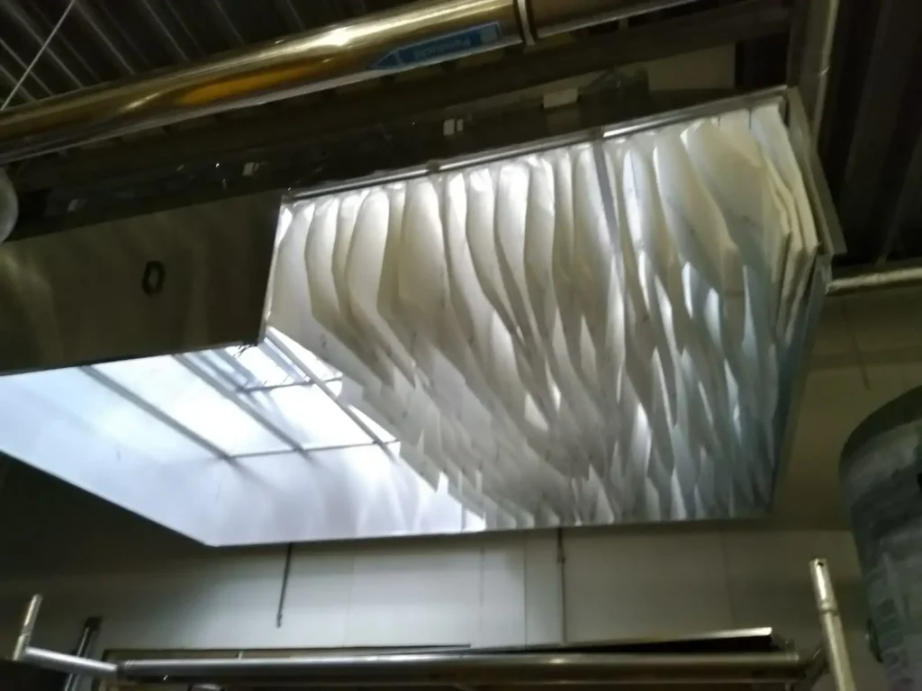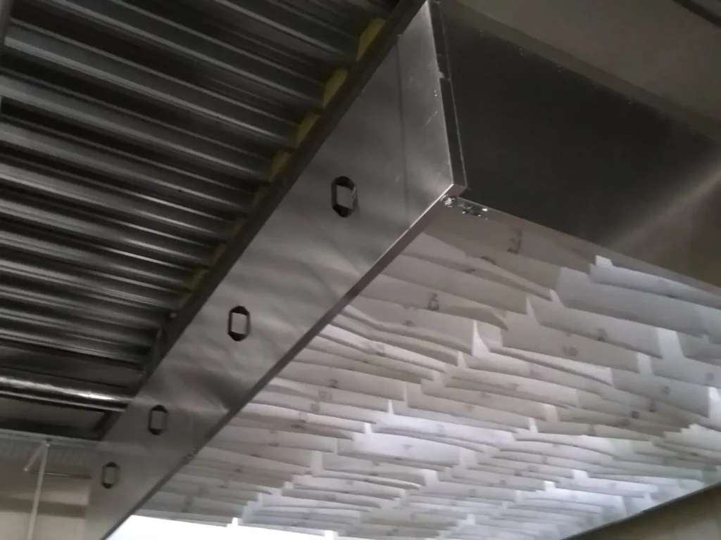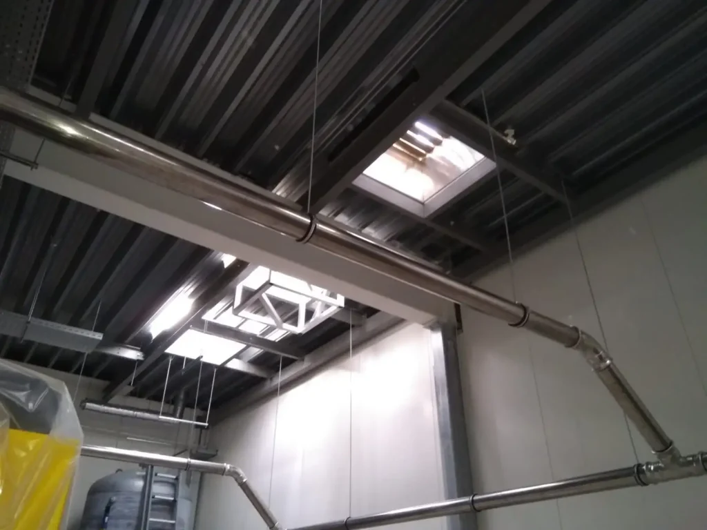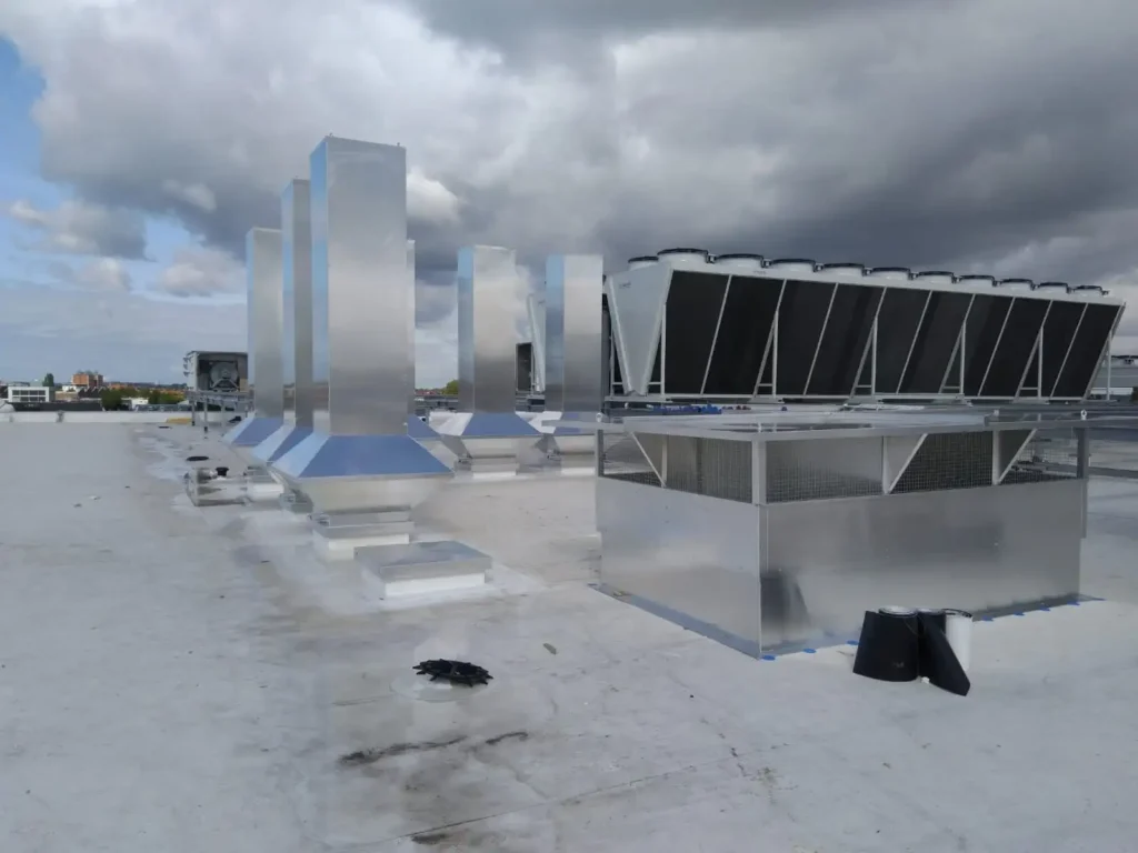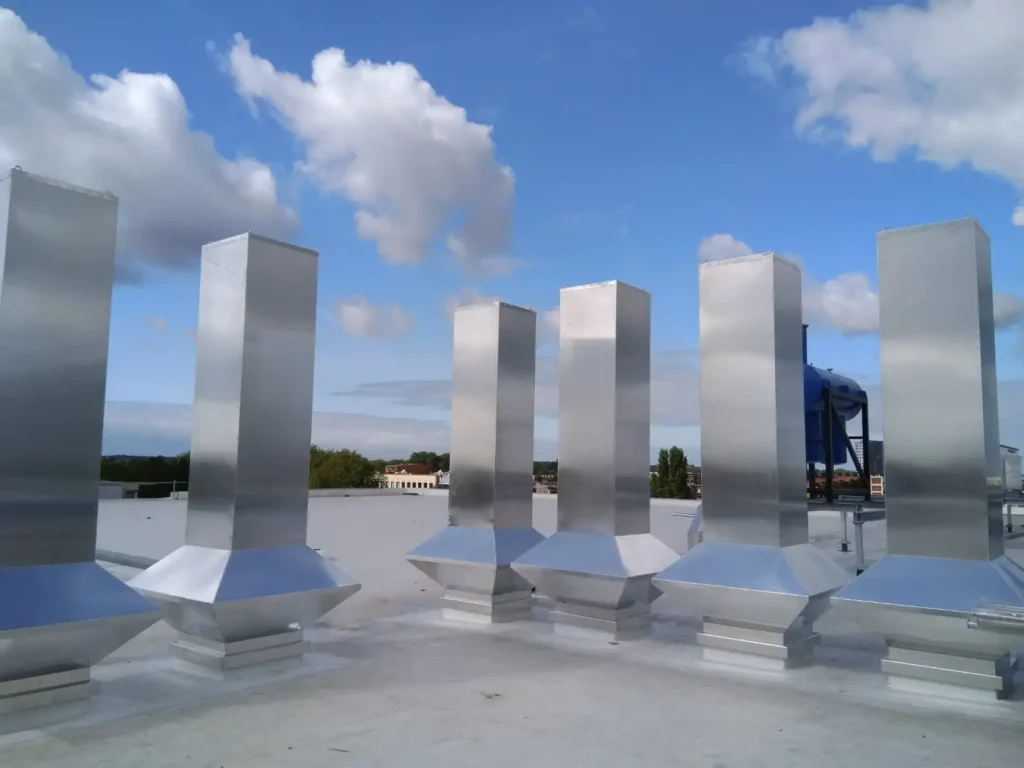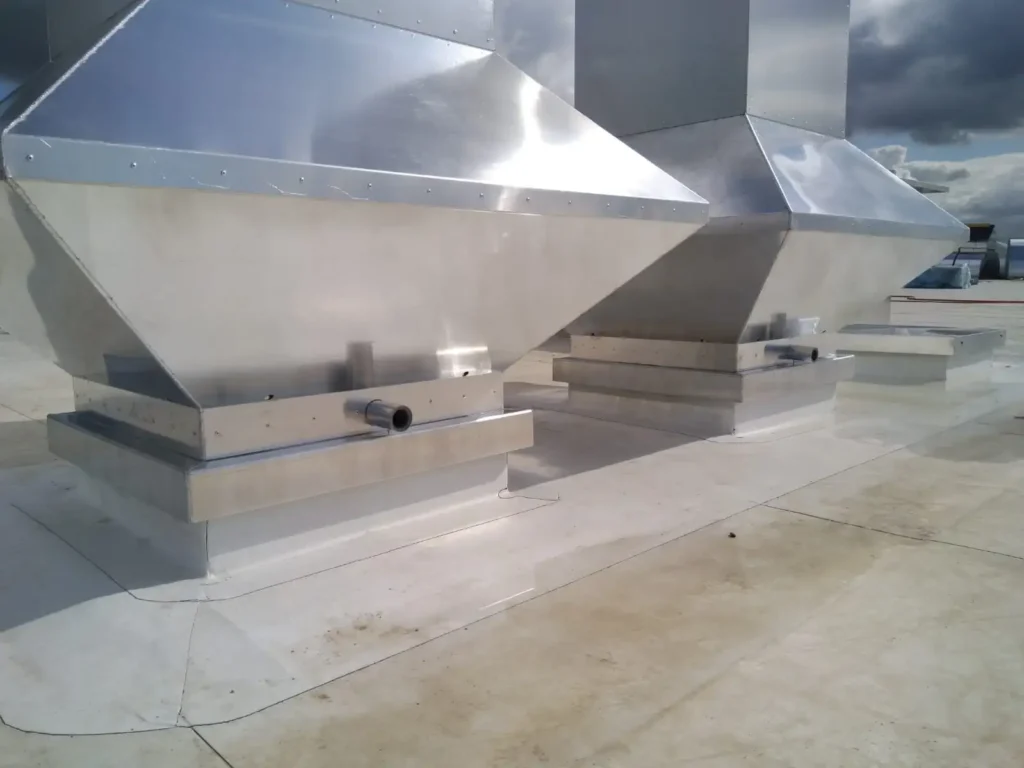 De afvoeren mochten echter niet met tuidraden of een ander soort staaldraad geborgd worden. Wij hebben vervolgens in onze fabriek een speciale vierkante beconic kap van 80 x 180 cm vervaardigd, met een lengte van circa 7 meter, waarvan 4 meter bovendaks. Tevens werd er een plakplaat/sokkel ontworpen van 8 mm aluminium, die zowel op als onder de dakconstructie is gemonteerd. Om het gewicht goed te kunnen verdelen is het beconic deel laag gehouden, ondanks het feit dat deze kappen stormbestendig zijn. Wat afgevoerd wordt, moet ook worden toegevoerd. Daarvoor heeft HDA een grote beluchtingskap gemaakt.